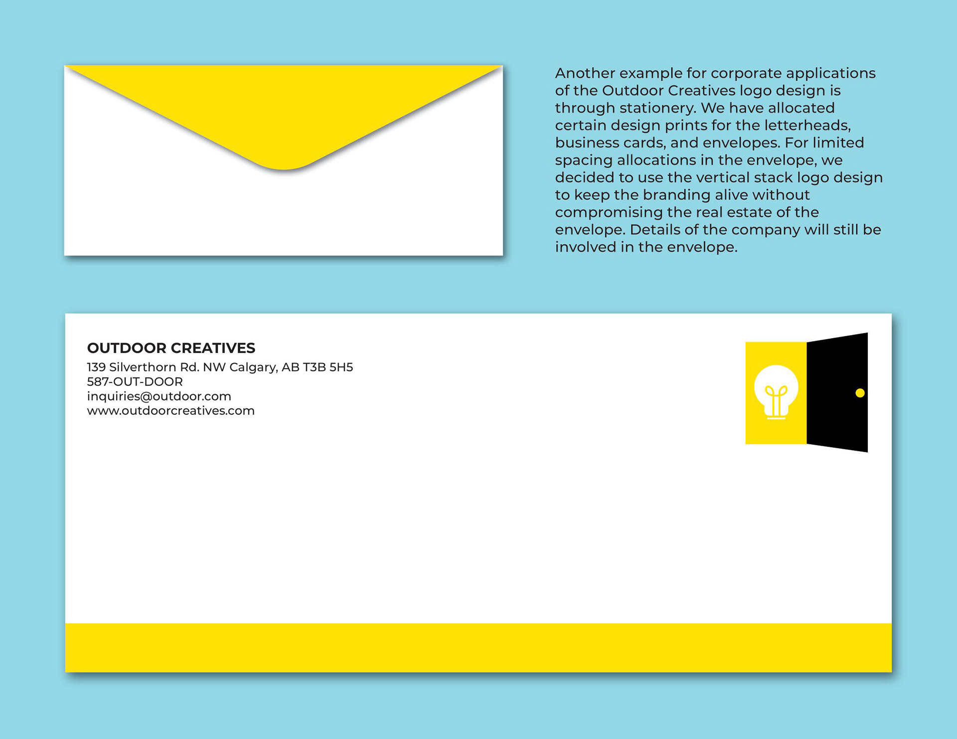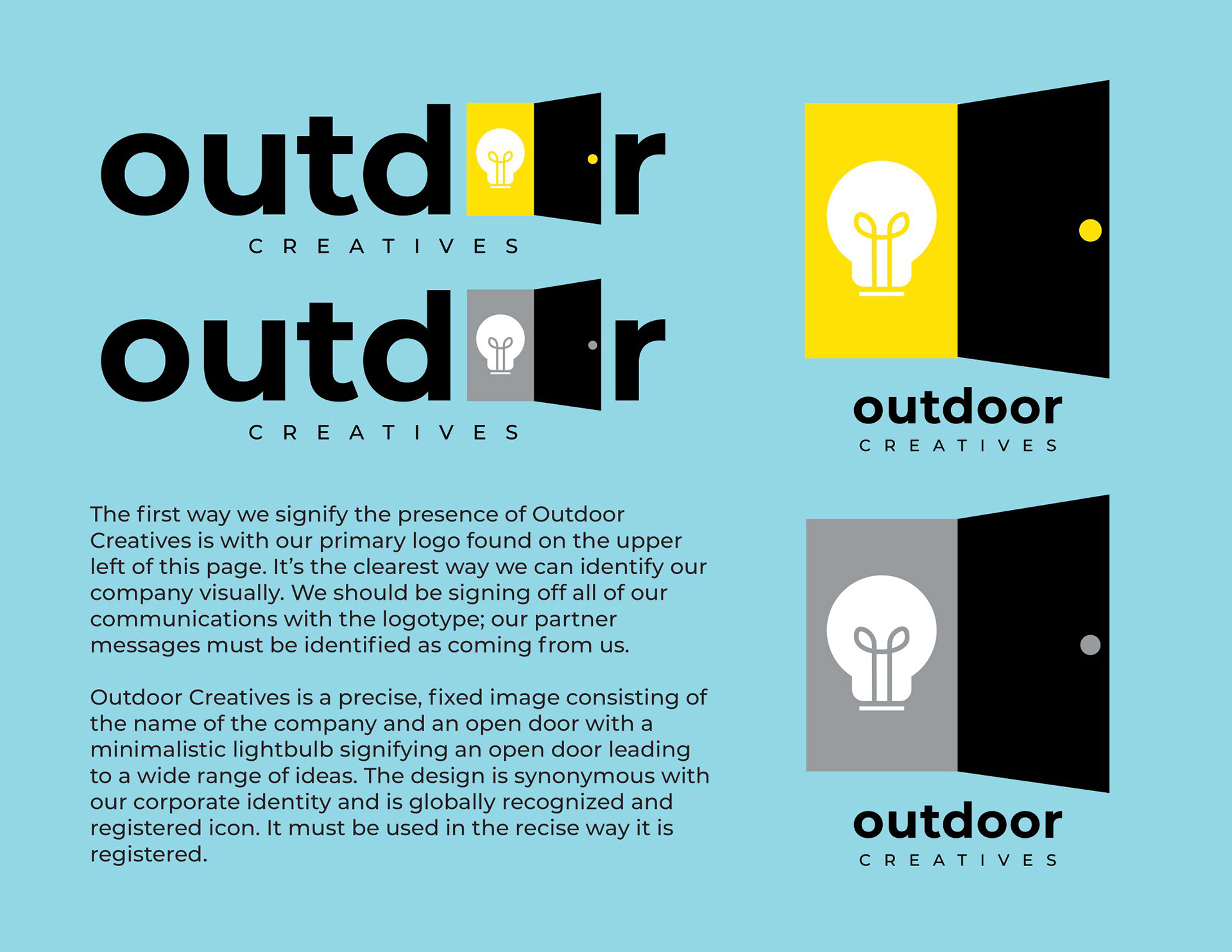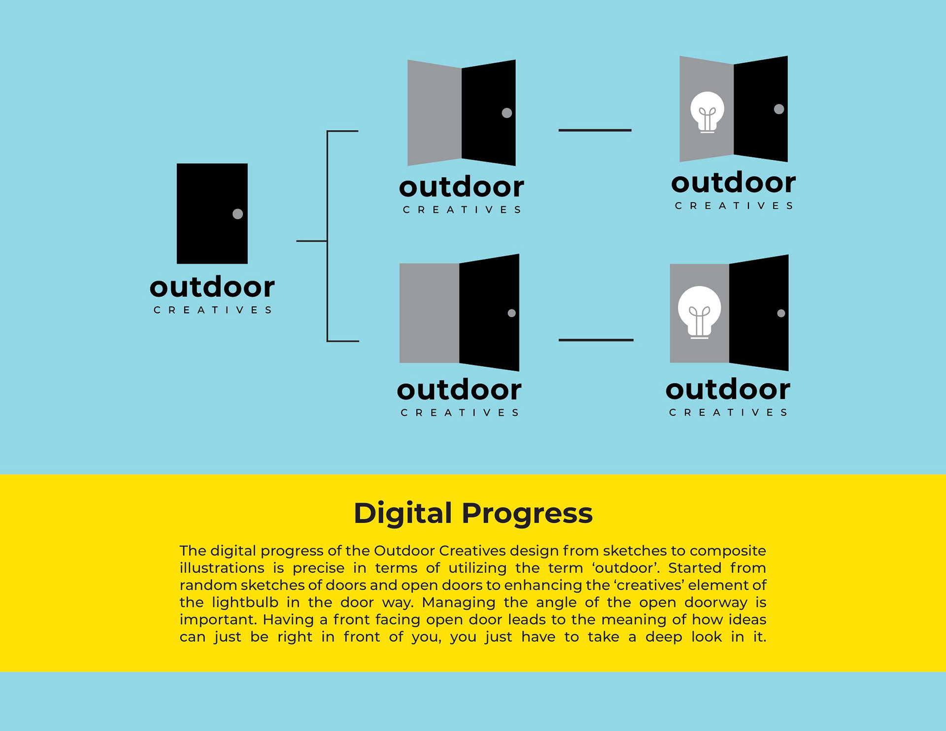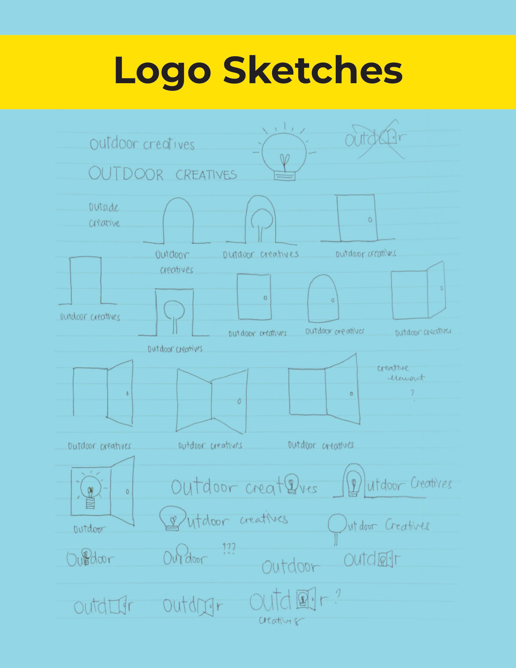 Outdoor Creatives is a brand identity project built around the concept of creativity, opportunity, and fresh ideas. The visual identity centers on a logo that combines an open door with a lightbulb positioned within the doorframe, symbolizing new ideas, exploration, and the limitless possibilities that come with creative thinking. The goal of this project was to design a brand that feels inviting, imaginative, and forward-thinking while maintaining a professional and modern aesthetic.
