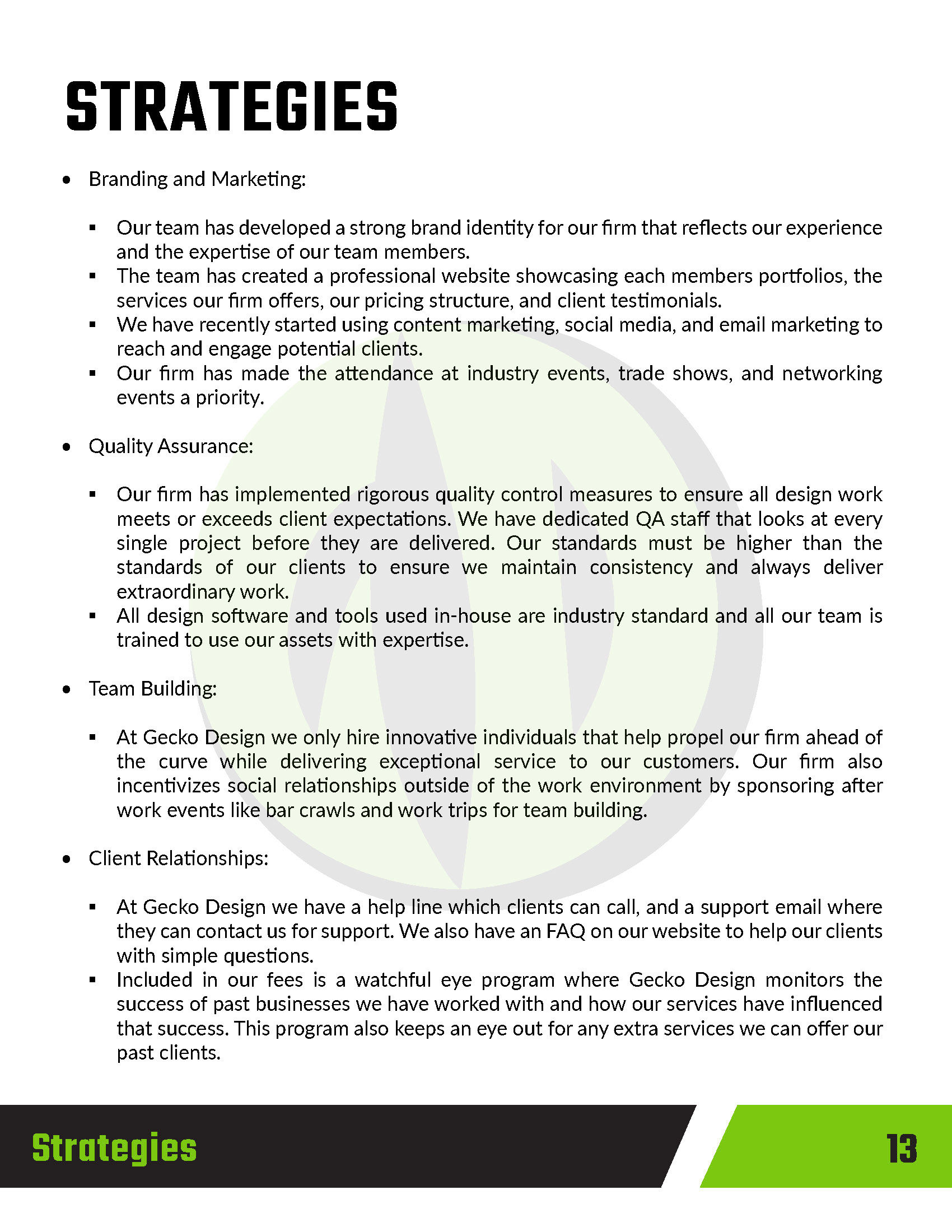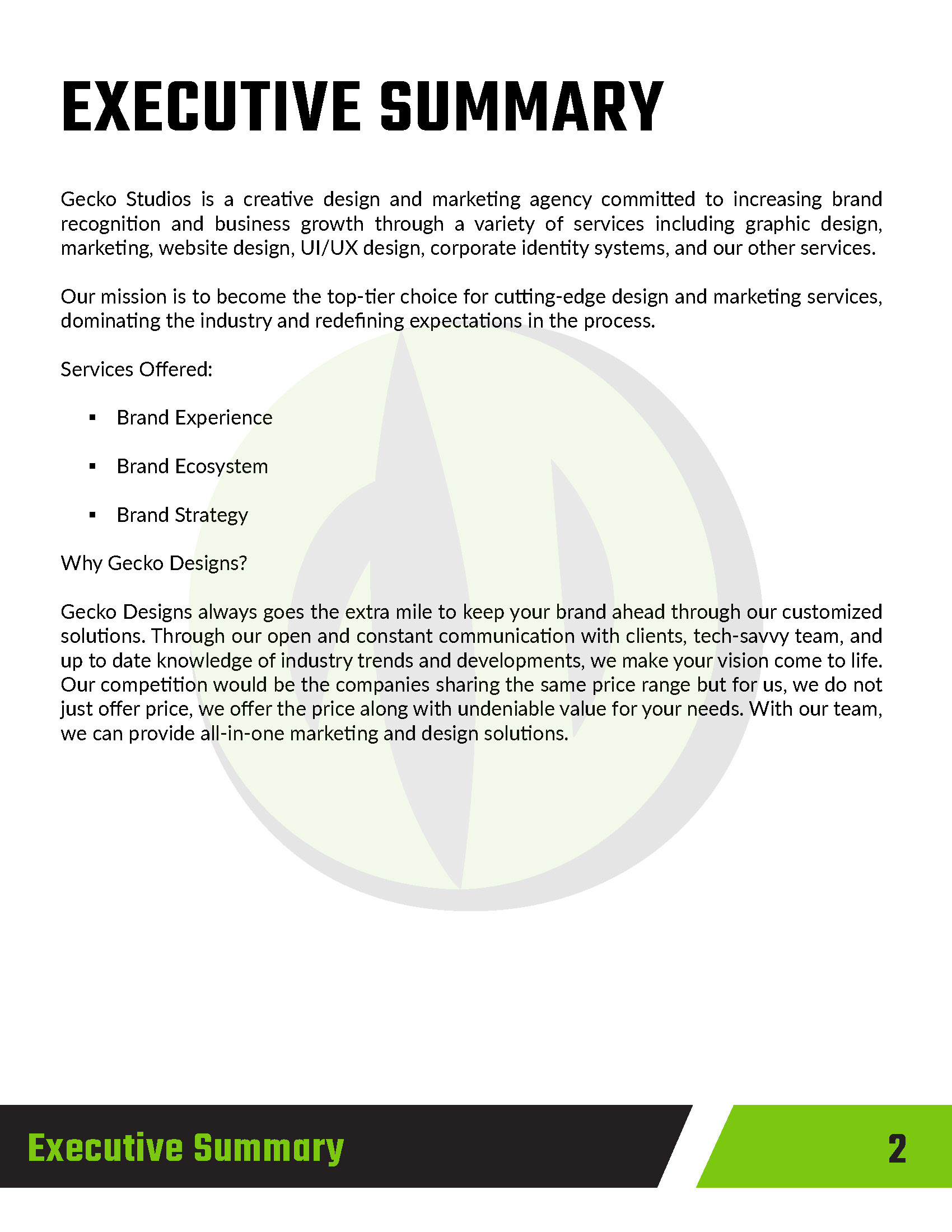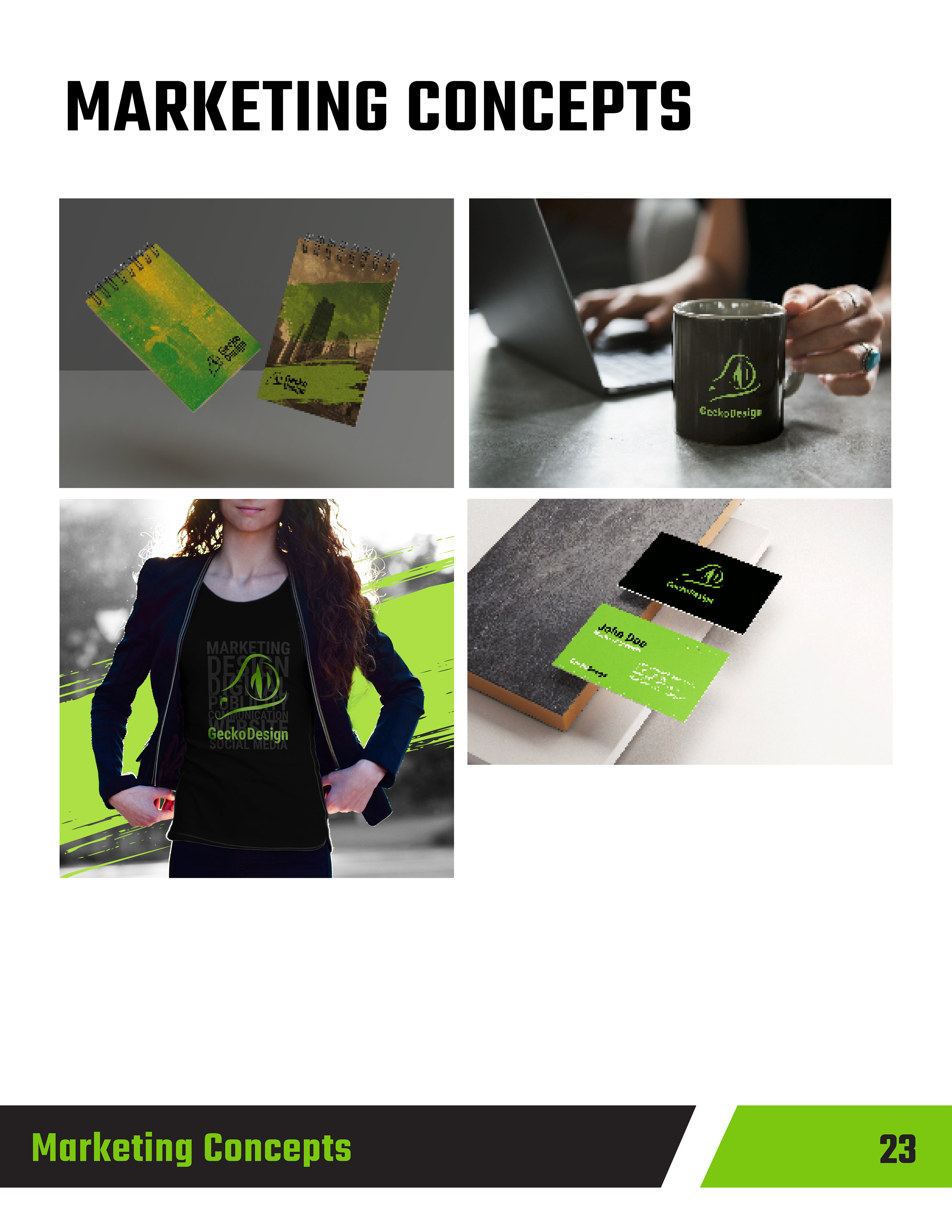This project involved creating a comprehensive business plan and pitch for Gecko Design, a conceptual creative and marketing agency. The goal was to present a clear, professional vision for the agency, outlining its services, target audience, brand positioning, and growth strategy. The pitch was designed to communicate the agency’s identity as innovative, adaptable, and results-driven, using visually engaging layouts, concise copy, and supporting graphics to reinforce key points. Elements included market research, service offerings, branding concepts, and a roadmap for client engagement and expansion.