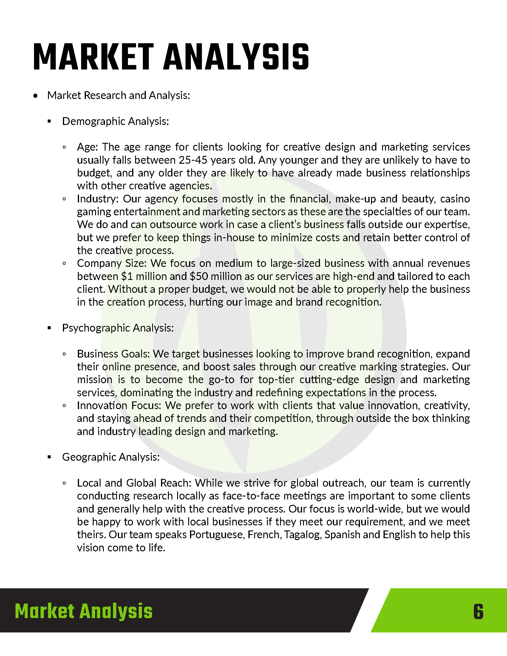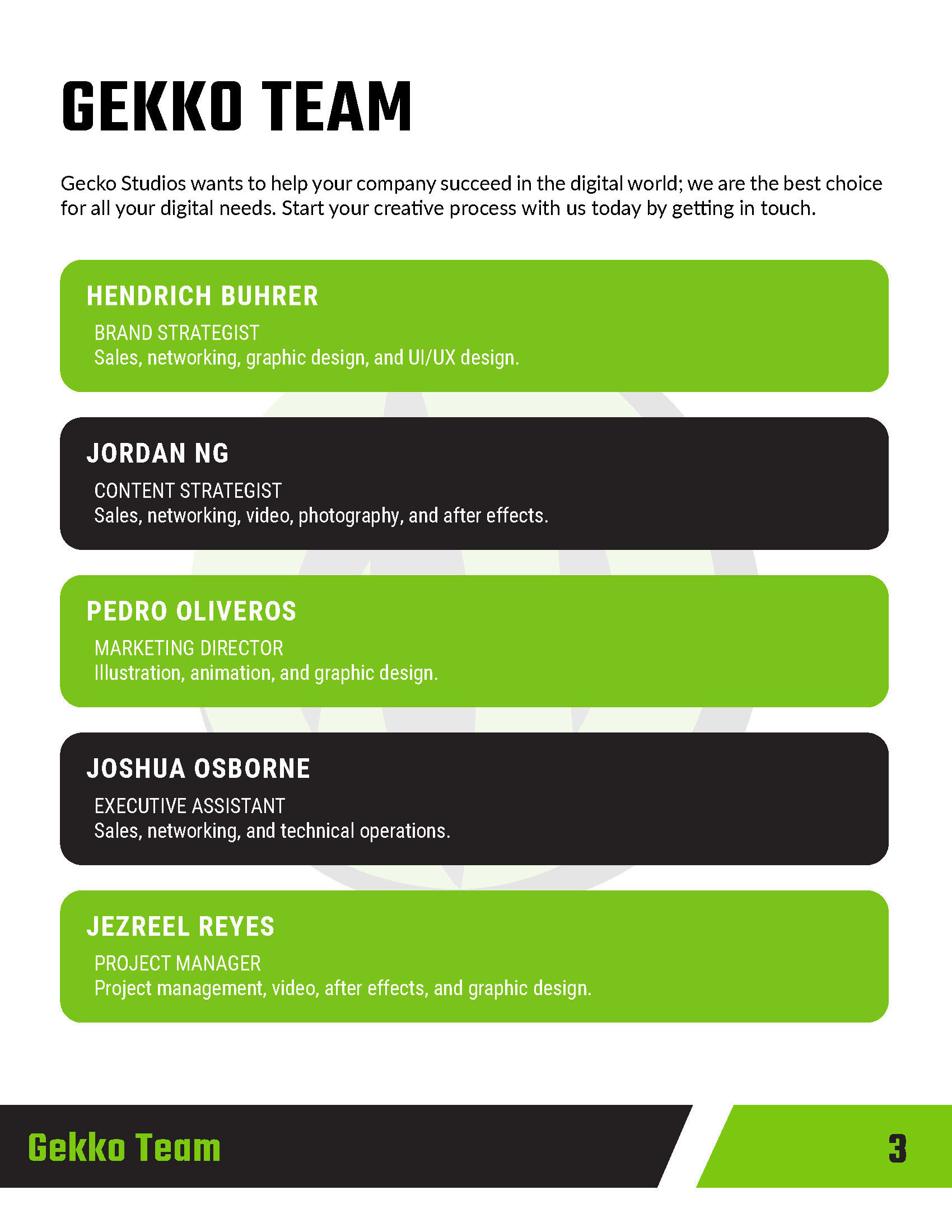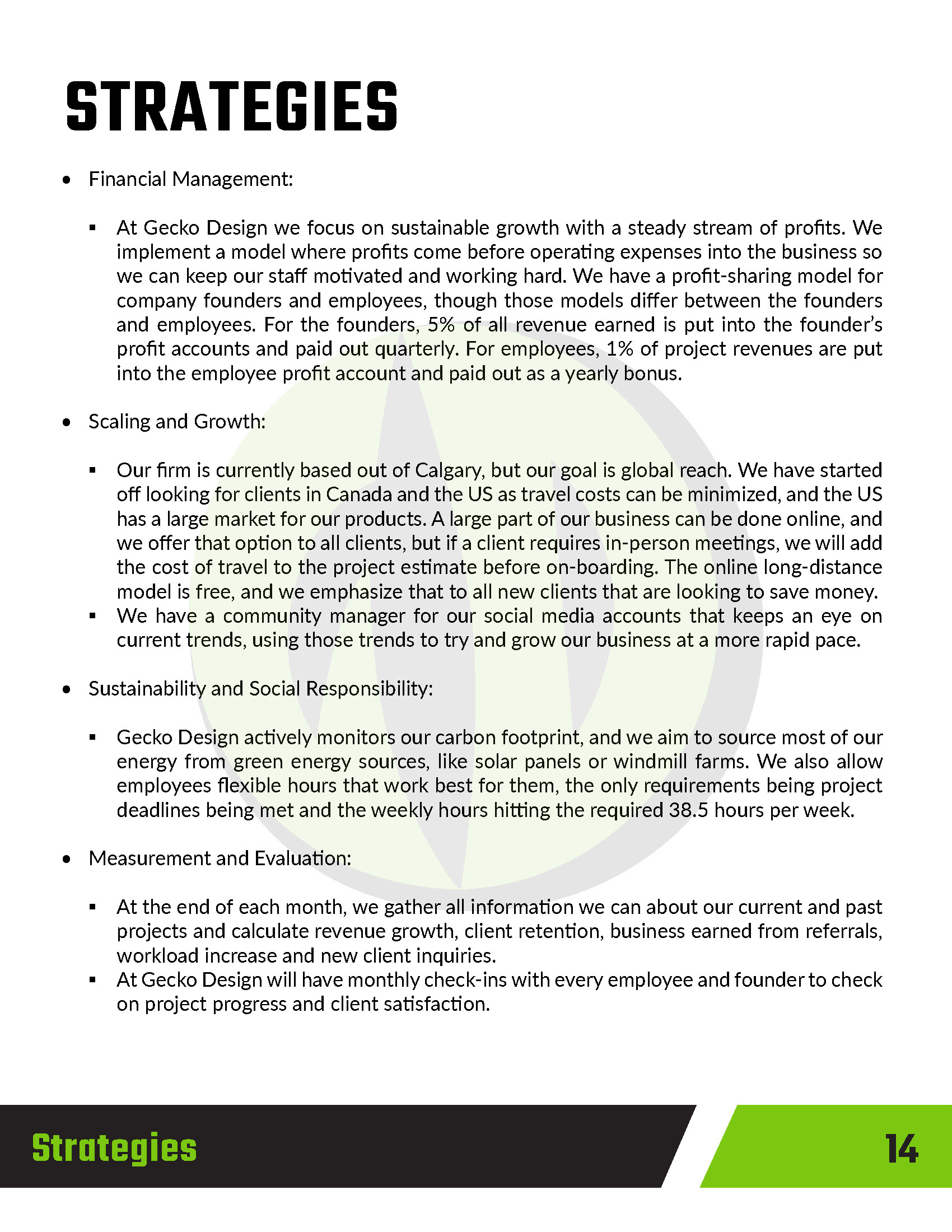 This project involved creating a comprehensive business plan and pitch for Gecko Design, a conceptual creative and marketing agency. The goal was to present a clear, professional vision for the agency, outlining its services, target audience, brand positioning, and growth strategy. The pitch was designed to communicate the agency’s identity as innovative, adaptable, and results-driven, using visually engaging layouts, concise copy, and supporting graphics to reinforce key points. Elements included market research, service offerings, branding concepts, and a roadmap for client engagement and expansion.